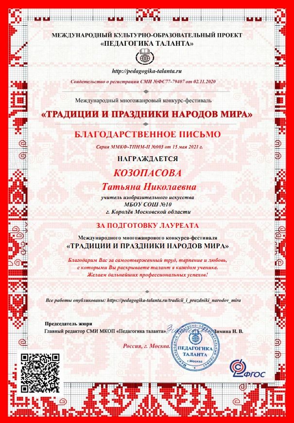 Международный многожанровый конкурс-фестиваль Благодарственное письмо за подготовку лауреата 1 степени КОЗОПАСОВА Татьяна Николаевна учитель |