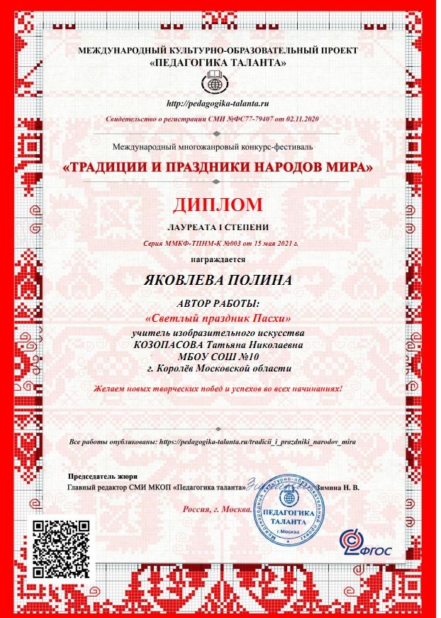 Международный многожанровый конкурс-фестиваль ЯКОВЛЕВА ПОЛИНА Лауреат 1 степени |